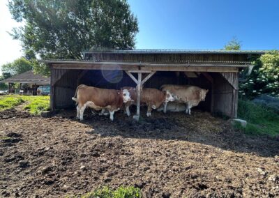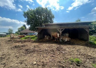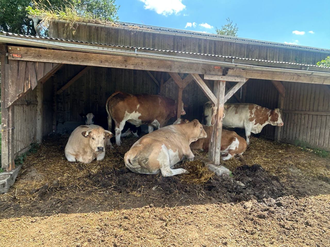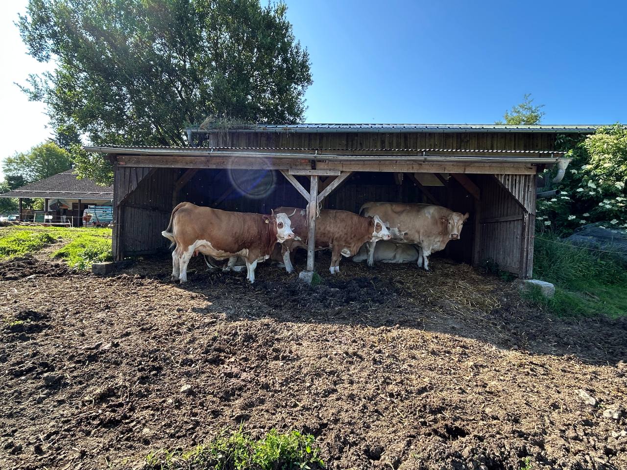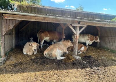 The sun is shining in full force these days – and our cows feel it too. During the warmer hours, they prefer to rest in their covered shelter, where it’s cool, quiet, and shaded.