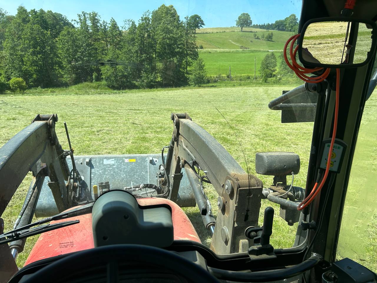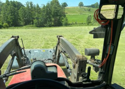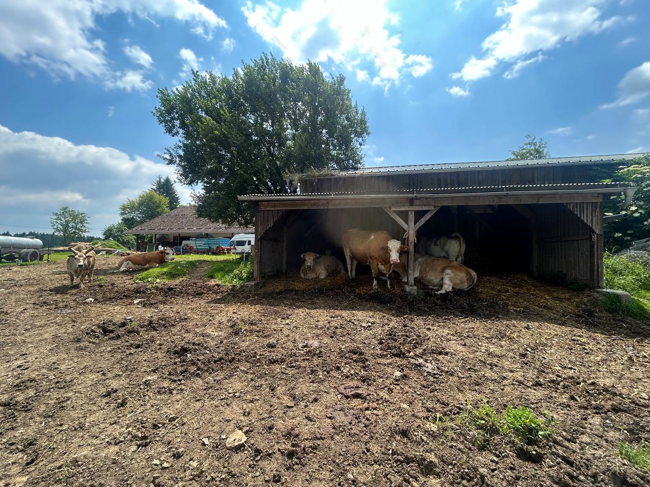 Fresh hay has just been harvested from our own fields. It is now being stored and partly fed directly to the animals. The cows are currently enjoying one of the summer pastures, where they graze peacefully on lush green grass.